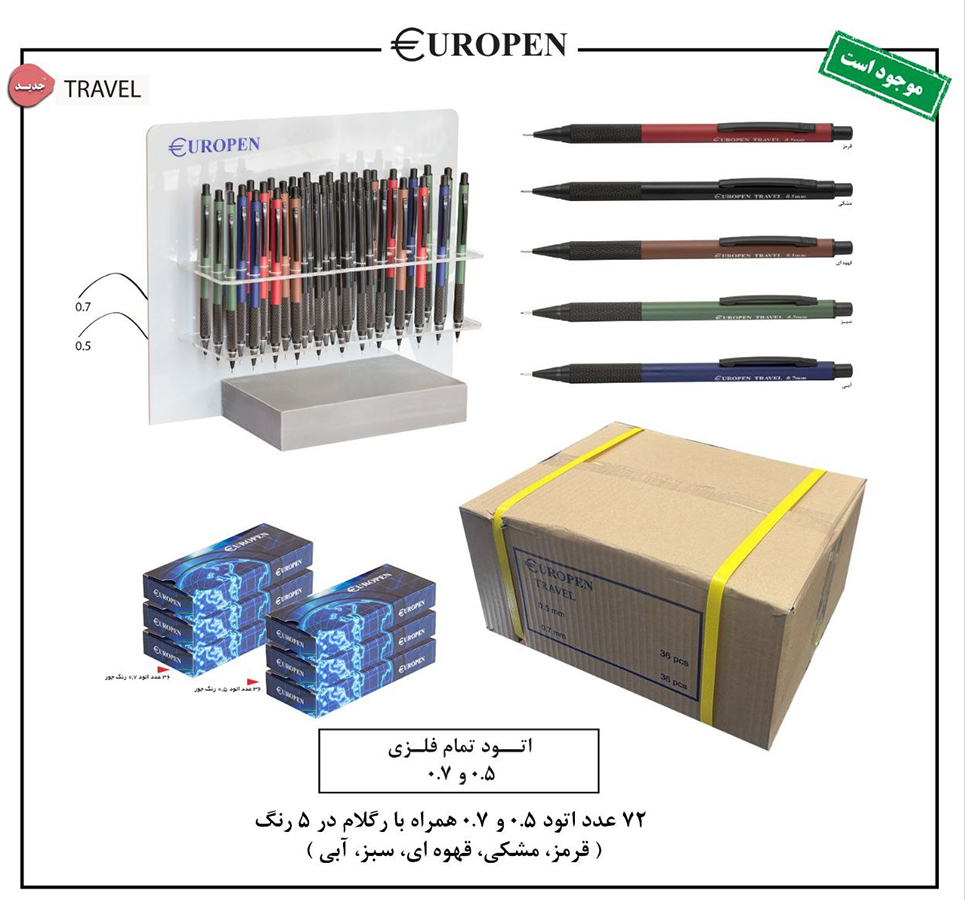 اتود (مداد نوکی) فشاری مدل Travel یکی از جدیدترین تولیدات برند شناخته شده یوروپن در گروه اتودهای با ساختار بدنه تمام فلزی است که در دو سایز نوشتاری 0.5 و 0.7 میلی متر و همچنین 2 میلی متری طراحی و تولید شده است. این اتود در 5 رنگ بندی مختلف آبی، مشکی، قرمز، قهوه ای و سبز تولید و روانه بازار شده و محصول مورد نظر ما دارای قطر نوشتاری 0.5 میلی متر و 0.7 میلی متر است. محتوای بسته بندی آن نیز در 72 عدد بصورت 36 عدد اتود سایز 0.5 و 36 عدد اتود سایز 0.7 میل به همراه رگلام بفروش میرسد.